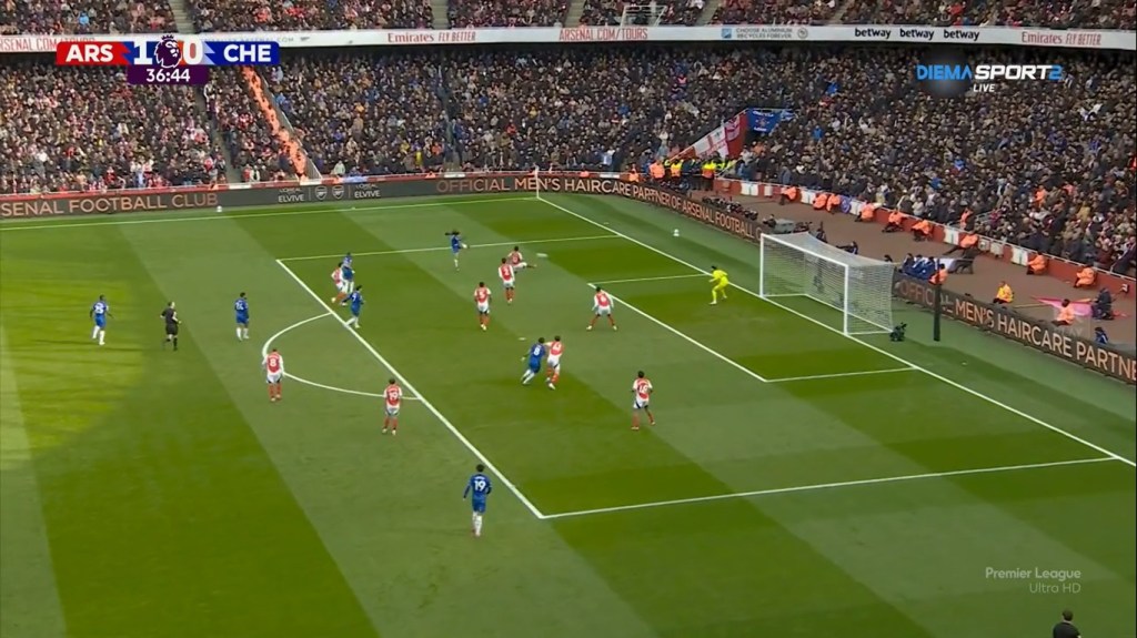 El grosor de los ataques iría a cargo de los Gunners, los cuales aprovecharían para lanzar balones a la espalda de Cucurella, a la cual no llegaba Badiashile para realizar coberturas, y el primer gol llegó con una especialidad de la casa, jugada a balón parado, en este caso de córner, con un centro de su capitán Ødegaard al primer palo donde llegaría Mikel Merino para peinar el balón hacia el segundo palo y así estrenar el marcador.