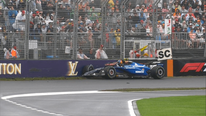 Alrededor de la vuelta 44 comenzaría el caos, debido a la fuerte tromba de agua que estaba cayendo sobre el circuito de Melbourne. La lluvia pillaría desprevenidos a los pilotos de naranja y Óscar Piastri trompearía quedándose un buen tiempo en el césped pero pudiendo salir, aunque se incorporaría en la parte trasera de la carrera. Lando Norris pararía en boxes mientras que Verstappen seguiría en pista. La jugada les salió bien a los que pararon en boxes y cuando paró Verstappen, Lando Norris ya estaba por delante de él (jugada nefasta para los ferrari que se reincorporarían a pista noveno y décimo cuando antes de la lluvia iban en sexta y octava posición).