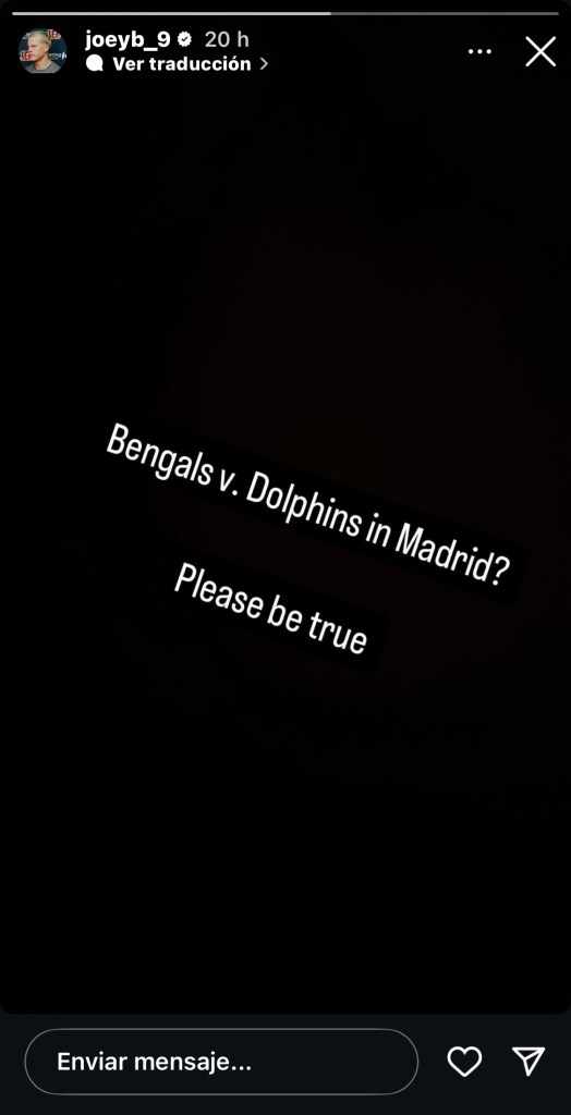 En lo que parecía que podría haber sido un posible hackeó, el Quarterback de los Bengals publicó un story en Instagram diciendo «¿Bengals contra Dolphins en Madrid? Ojalá sea verdad «.