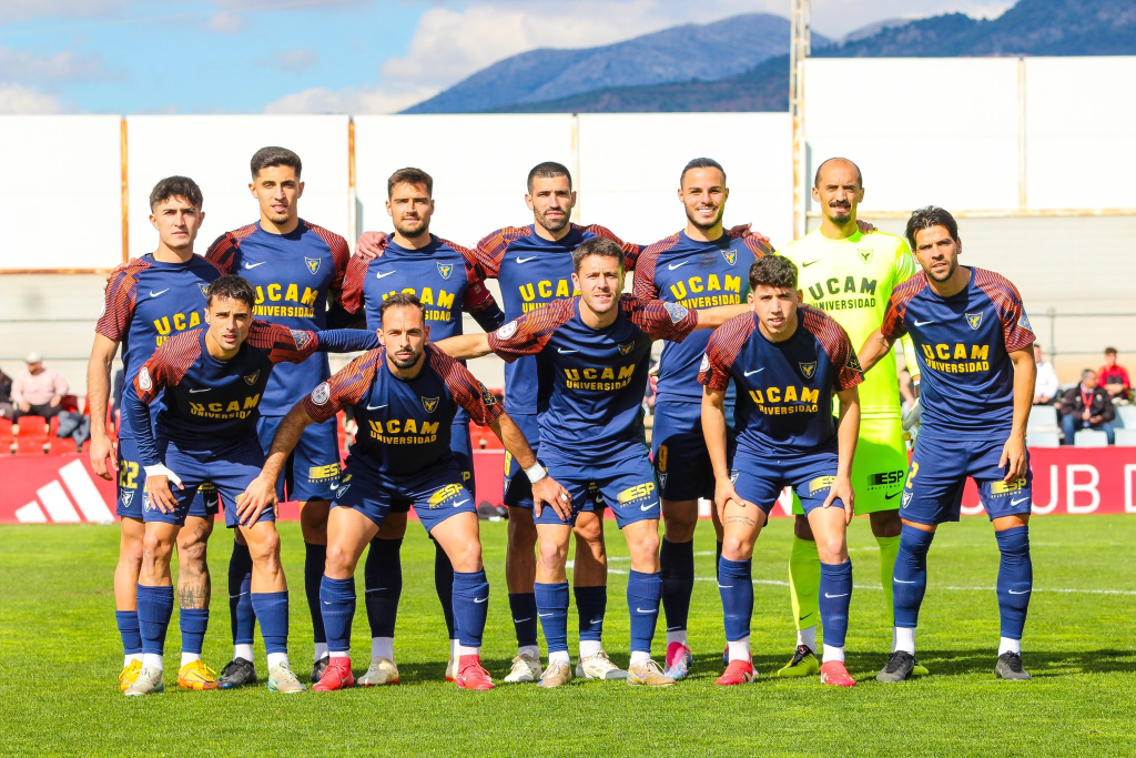 Los titulares del UCAM Murcia posan antes de su último partido contra el Recreativo Granada/ X @UCAMMurciaFC