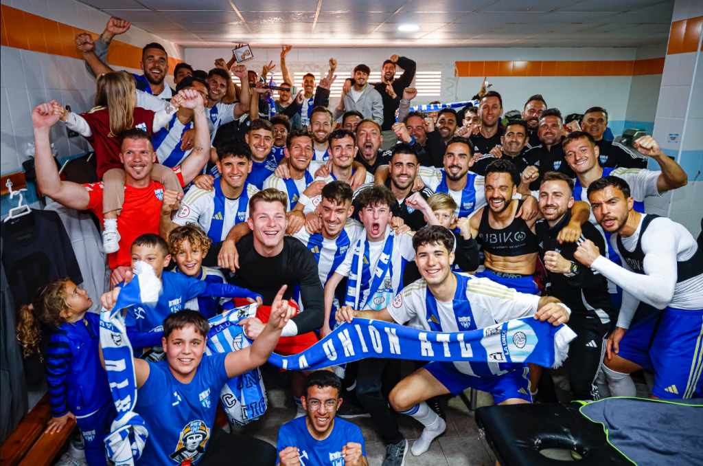 Los jugadores, el cuerpo técnico y algunos aficionados de La Unión celebran en el vestuario la victoria ante el Xerez CD/ X @fclauniónatl