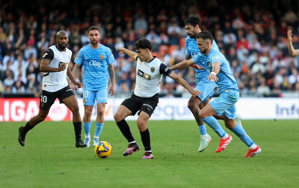 En los primeros 45 minutos hemos visto un juego parejo de los dos equipos; el Mallorca ha empezado mejor y ha dominado los primeros 20 minutos. Rápidamente, el Valencia se ha adueñado del esférico y acto seguido ha llegado la primera ocasión clara del partido después de que Javi Guerra chutase en la frontal del área, el esférico rebotase en Antonio Raíllo y seguidamente golpease en el poste de la portería defendida por Dominik Greif. Pero la ofensiva valencianista no acababa aquí, ya que en el córner siguiente, Umar Sadiq vencía al debutante David López en su peculiar duelo aéreo para, de cabeza, enviar un balón que parecía imparable, pero que milagrosamente, tras una gran estirada del portero mallorquinista, Dominik Greif, sobre la línea, evitaba que el 1-0 subiese al marcador.