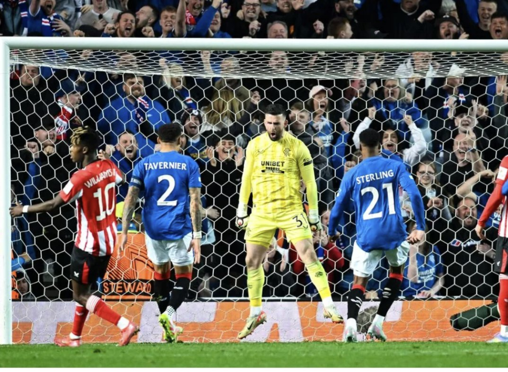 Un Rangers con diez resistió desde el minuto 13; Kelly detuvo un penalti a Berenguer y la vuelta en Bilbao será decisiva.
