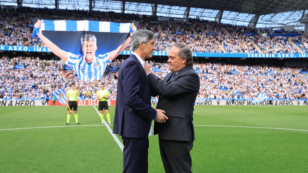 Antes del comienzo del encuentro, el presidente de la Real Sociedad Jokin Aperribay homenajeo al tecnico oriotarra con la insignia de oro del equipo txuriurdin.