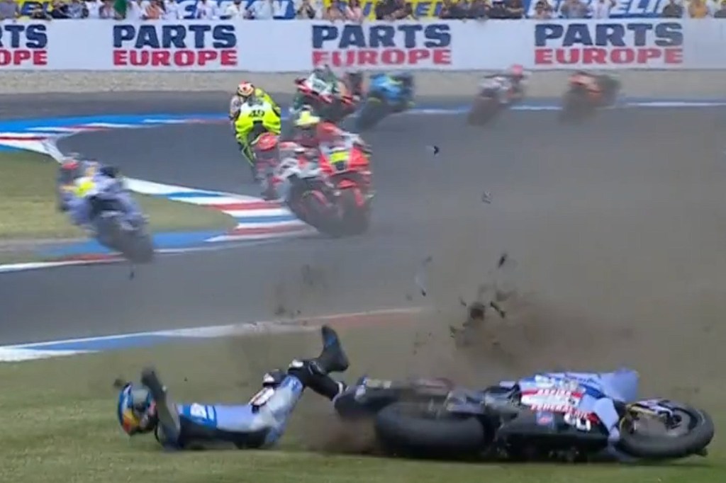 El piloto de Gresini, tras batallar agresivamente con el murciano Pedro Acosta, salió muy mal parado del desafortunado lance producido entre estos dos, concluyendo con la aparatosa caída del pequeño de los Márquez provocándole así la fractura del segundo metacarpiano de la mano izquierda.