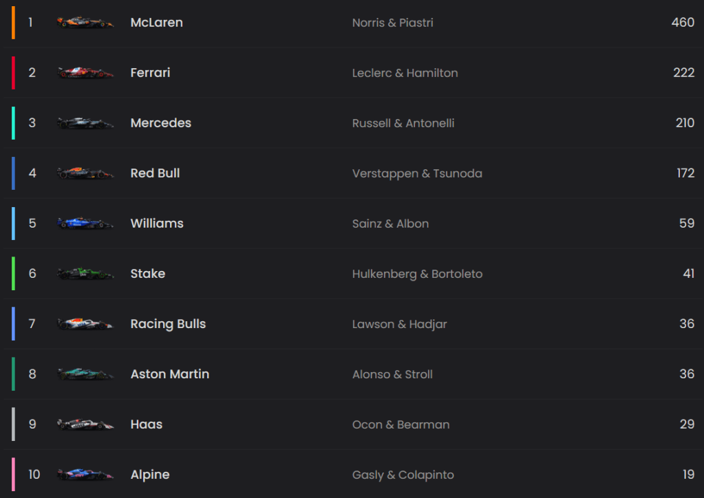 En constructores, hay cambios en la zona media. Aston Martin y Racing Bulls empatan a puntos y superan a Haas, que cae a la novena posición. Sauber se aúpa hasta la sexta posición y se acercan al equipo Williams.