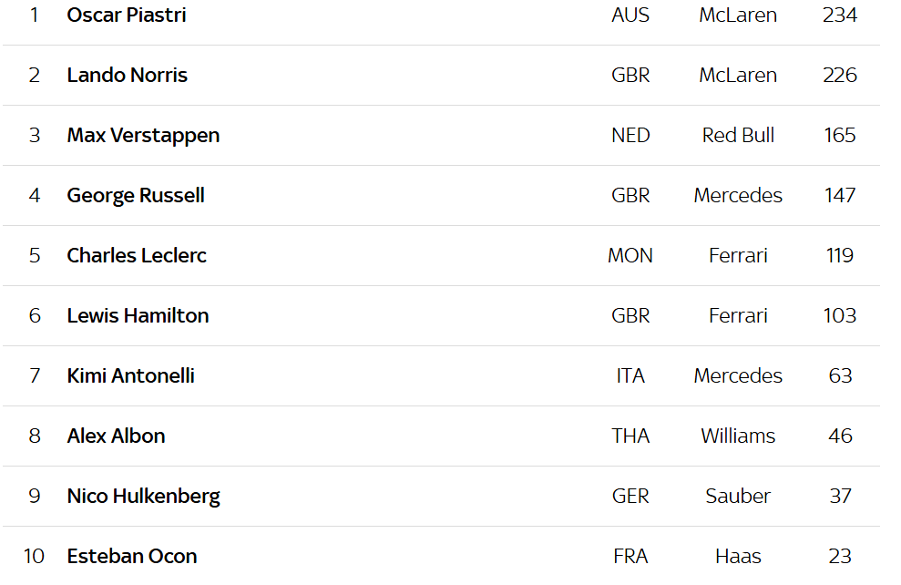 Clasificación de los 10 primeros pilotos del Mundial de F1. Vía: Sky Sports