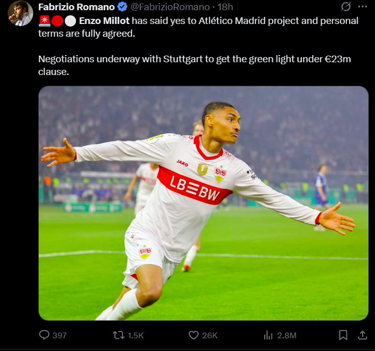 Debido a estos motivos, el Atlético no ha dudado ni un segundo en lanzarse a materializar el fichaje de Enzo Millot, y todo dependerá de las exigencias del Suttgart y del agente del propio jugador, pero Enzo ha demostrado estar dispuesto a ser entrenado por Simeone para el siguiente curso y jugar en un club de gran importancia mundial.