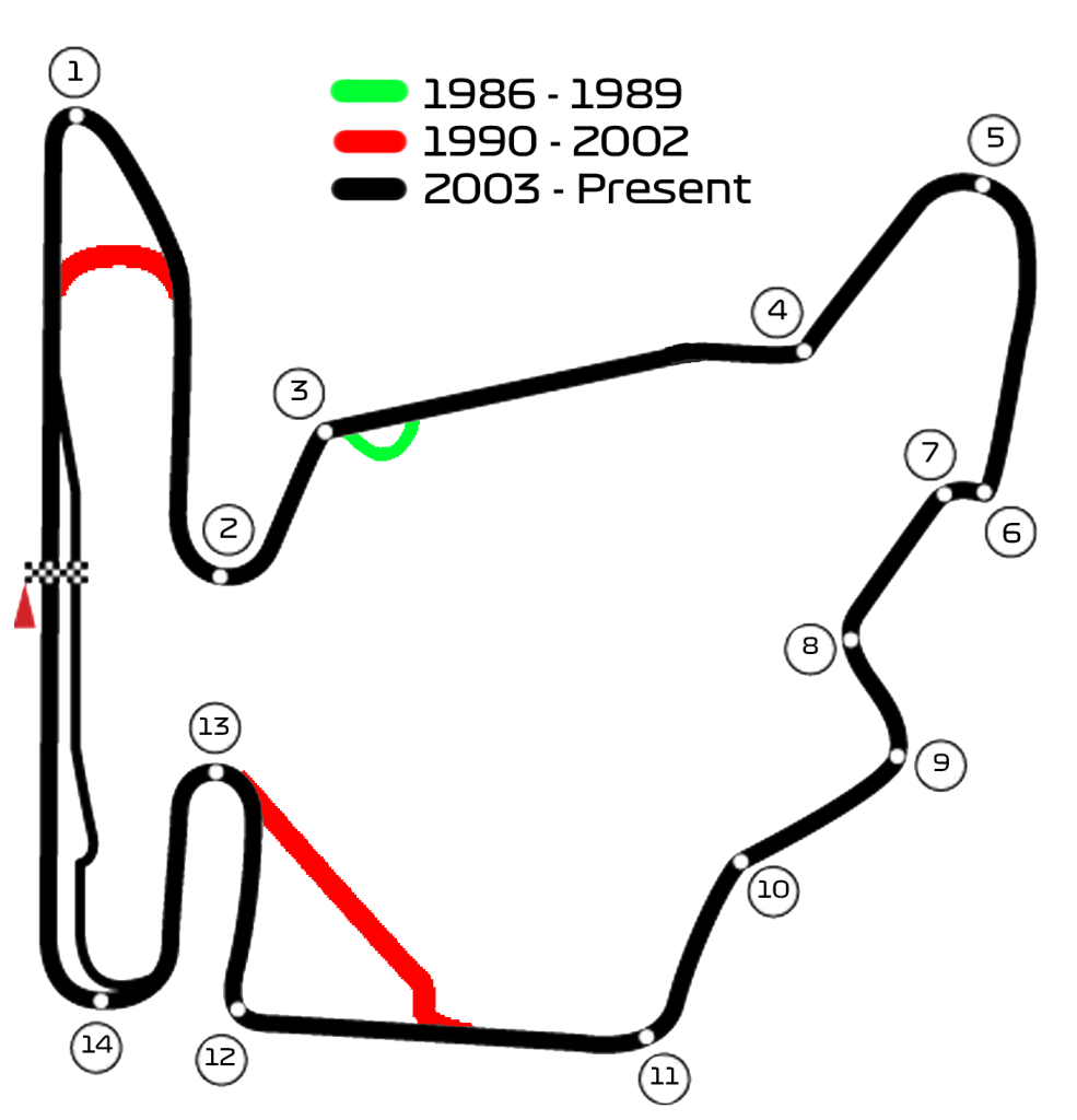 Este circuito tuvo dos fases. La primera que duró desde 1986 hasta 2002 y la fase actual, que empezó en 2003. Ese año, se ensanchó el circuito y se eliminaron curvas del primer y tercer sector.