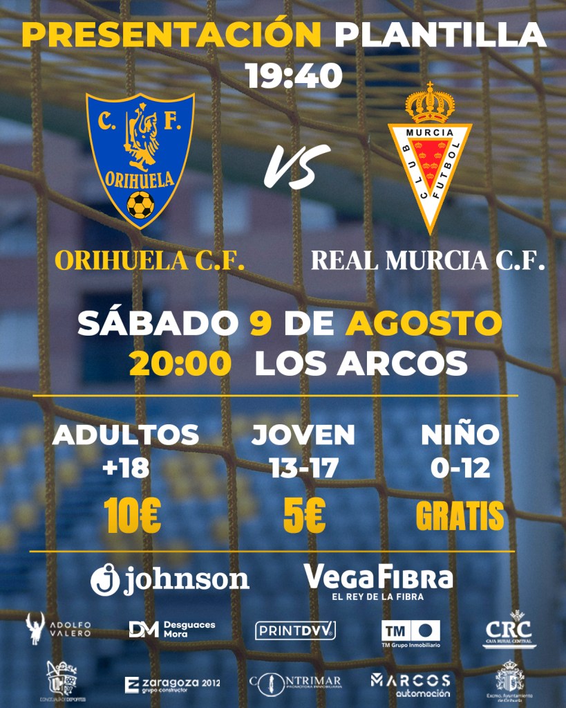 Tras la victoria lograda en Rojales, el Orihuela afronta su siguiente duelo que lo llevará a enfrentarse a un histórico como es el Real Murcia C.F. El encuentro tendrá lugar este sábado 9 a las 20:00 en Los Arcos, también se realizará la presentación del equipo oficial de la 25/26, antes del comienzo del partido.