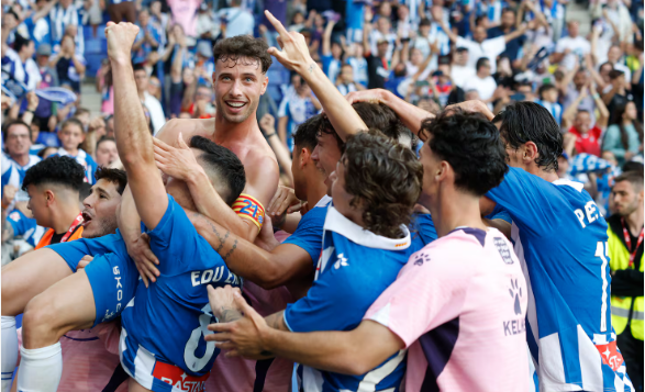 Los jugadores del Español levantan a Javi Puado tras dar la salvación al equipo/ Diario AS