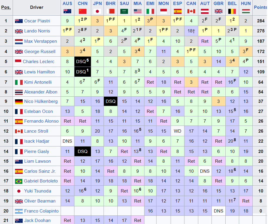 Tras el Gran Premio de Hungría, la distancia entre Lando Norris y Oscar Piastri se redujo a los 9 puntos, con éste último por delante.