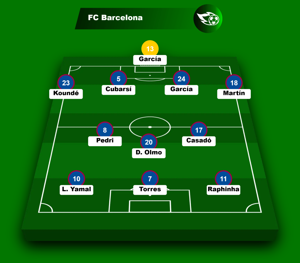 Joan García en la portería. Kounde en el lateral derecho, Eric Garcia y Cubarsi como centrales y Gerard Martín en la izquierda. Pedri, Casado y Dani Olmo en el centro del campo. Raphinha, Rashford en sustitución de Lamine y Ferran o Lewandowski en el ataque.