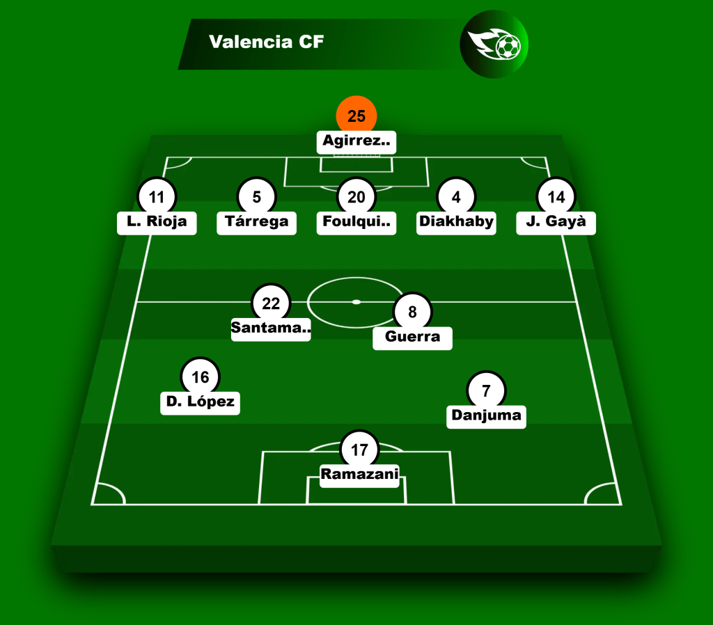 Julen Aguirezabala será el meta, los tres centrales Tarrega, Mouctar Diakhaby y Foulquier. Gaya en el carril izquierdo y Rioja en el derecho. Baptiste Santamaria acompañará en el centro del campo a Javi Guerra con Diego López como interior. Danjuma y Ramazani apuntan a ser los hombre que con su velocidad y desborde tumben al Barça.