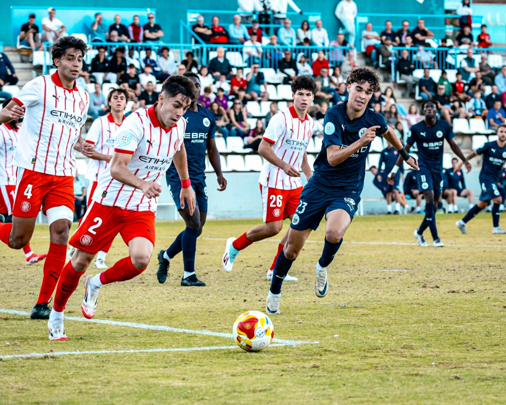 Los primeros compases fueron de puro tanteo, es decir, respeto por el adversario y ausencia de ocasiones. Hasta el minuto 6, cuando Sergi Puig erró un pase en salida de presión, de modo que Alya Camara se hizo con el cuero e hizo un pase de la muerte a Moró Sidibe, que no pudo finalizar jugada. Pese al susto, el Girona B continuó arriesgando desde atrás. No es para menos, puesto que es una de las cualidades del cuadro visitante.