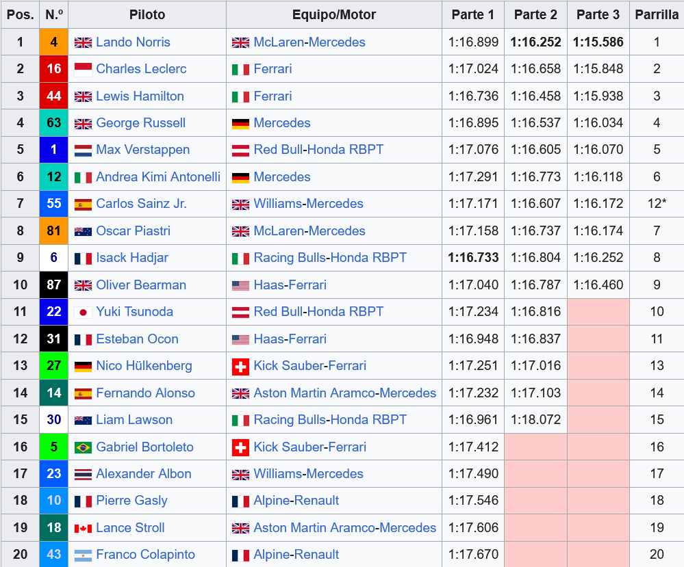 Los españoles nos dejan un resultado agridulce en México. Carlos Sainz ha destrozado en esta clasificación a su compañero de equipo. Mientras que Alexander Albon ha sido eliminado en la Q1, el madrileño ha quedado séptimo. Lamentablemente, acarrea una sanción de cinco posiciones en parrilla por el accidente del pasado Gran Premio de EEUU con Antonelli, por lo que saldrá 12º. Aún así, el ritmo de Carlos ha sido muy bueno y este trazado se le da muy bien (ya ganó en este circuito el año pasado).