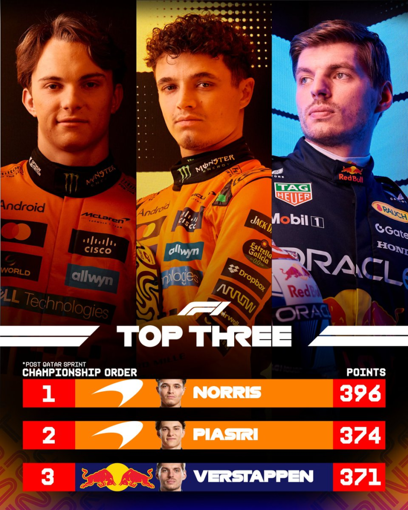 Óscar Piastri venció en la última carrera al sprint de este año para retomar el pulso por el campeonato. El australiano, famoso por su carisma de piloto frío y calculador, ha despertado en el momento más importante del año, puesto que llevaba 7 grandes premios sin subirse a cualquier cajón del podio y ha vuelto por la puerta grande. De las 3 carreras sprint que ha habido en el circuito de Lusail, Oscar ha ganado todas. Norris sigue aún con gran ventaja para llevarse el campeonato, pero no puede relajarse ante la determinación del propio Oscar y de Max Verstappen, que salió 6º y acabó 4º, quien acechó al propio piloto inglés durante la carrera.