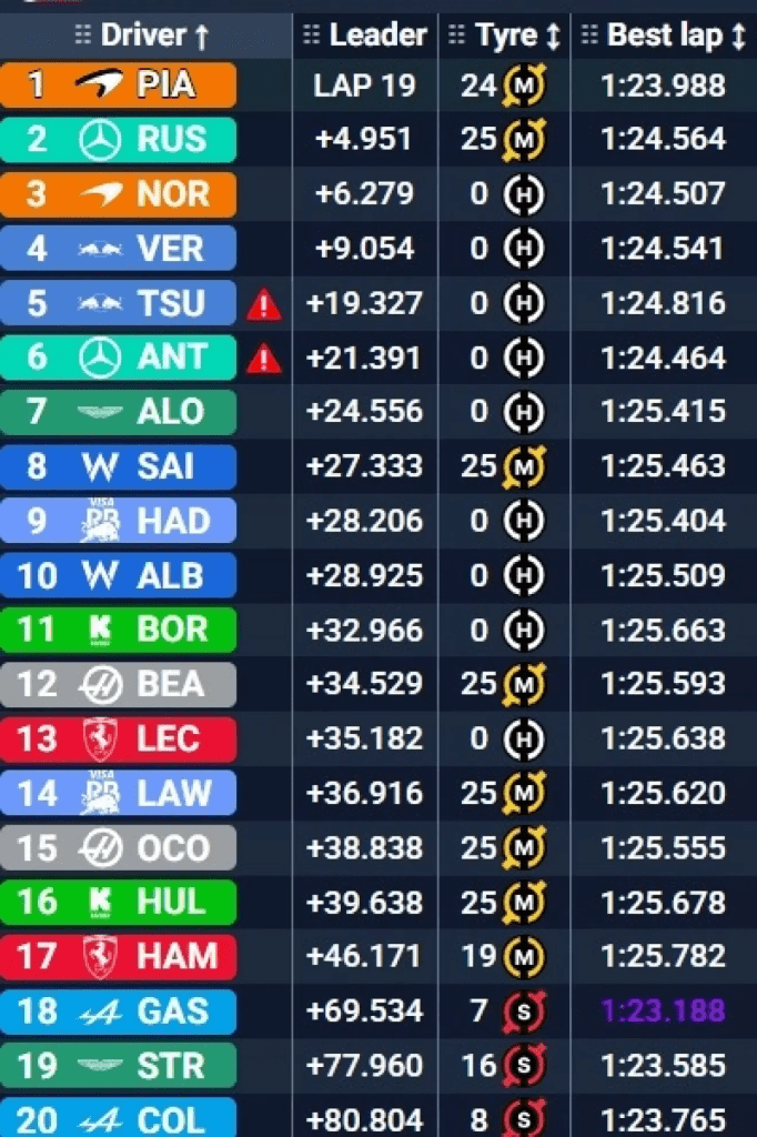 Antonelli pasa a Fernando, sanción para Tsunoda y victoria de Piastri (Vueltas 12-19):