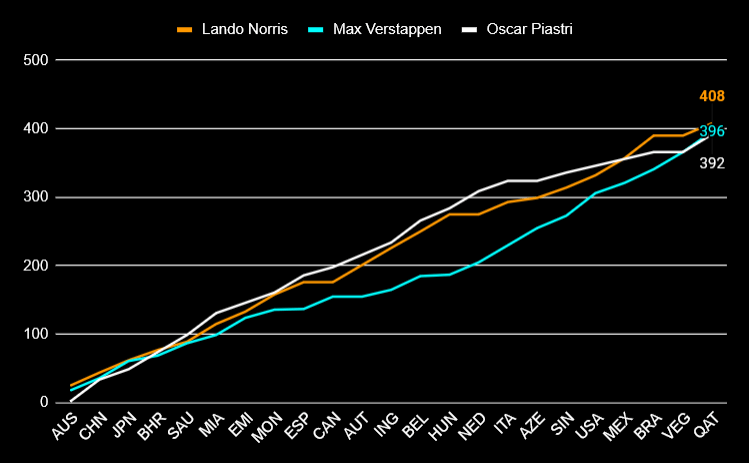 Los tres contendientes al campeonato llegan a la última carrera con Norris al frente, con 408 puntos. Justo detrás de él, Max Verstappen, a 12 puntos. Oscar Piastri está a 16 puntos y es el que menos opciones tiene.