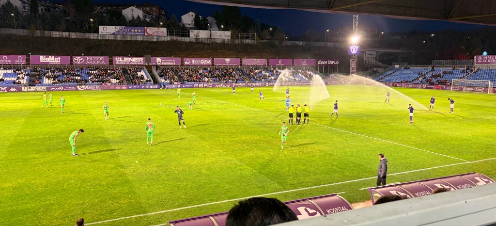 Y pudo ser aún mejor para los morados. Stamatakis evitó el segundo de los locales en el 12′ desviando con la punta de los dedos un disparo arriba de Toño Calvo, quien estaba resultando impredecible para el filial de Osasuna desde esa posición de enganche.