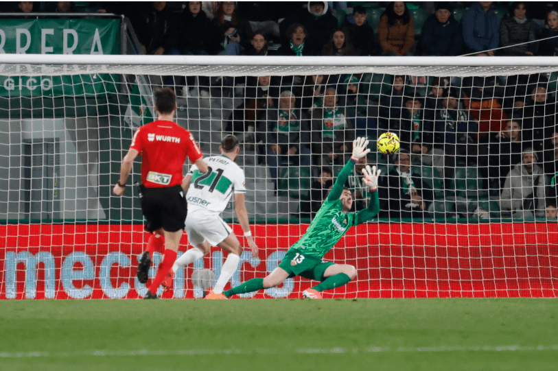 Nada más salir del vestuario el Elche ha vuelto a salir al máximo, volcando el campo a la portería sevillana, a los pocos minutos de la reanudación el guardameta heleno ha sacado una mano antológica a Germán Valera que ha evitado que la vaselina del extremo murciano cruzara la línea.