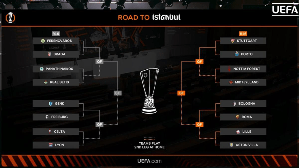 En el sorteo, el Celta solo tenía dos opciones, las dos bastante complicadas, Lyon y Aston Villa, los dos mejores equipos de la fase de liga de la Europa League y dos de los máximos favoritos al título, al final, eliminatoria en la que tocará jugar contra los franceses, a su vez, también se ha sorteado todo el cuadro hasta llegar a la gran final del 20 de mayo en Turquía, cuadro en el cual, el equipo olívico, sí que ha tenido algo de fortuna, ya que evita a grandes favoritos al título como Aston Villa, Porto, Forest o Roma. Si el conjunto celeste pasa la eliminatoria contra el Lyon, se tendrá que medir en cuartos al vencedor del Friburgo-Genk, con la vuelta en Balaídos, y en semifinales, en caso de que llegara, jugaría contra Ferenvacros, Braga, Betis o Panathinaikos, con también, la vuelta en casa. Los gallegos han tenido suerte en caer en la parte del cuadro, relativamente más asequible, si pasan contra el Olympique de Lyon, que es el gran hueso duro del cuadro junto con el Betis, el Celta partirá como uno de los grandes favoritos del lado izquierdo del cuadro, para estar en la final de Estambul.