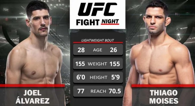 Para el segundo combate de la velada debemos viajar hasta el peso ligero. Allí veremos a un Thiago Moisés con 15 peleas en la compañía y un récord de 8-7 en UFC, aún así hay que tener en cuenta que el récord engaña. Moisés es una de esas pruebas de toque para ver si vales para la promotora y en sus 7 derrotas vemos los nombres de Islam Makhachev, Joel Álvarez, BSD y Dariush, casi nada. Por ahí viene su principal debilidad, pese a ser un gran grappler ha sido finalizado en 4 de sus 7 peleas y para él será clave llevar el combate a la lona.